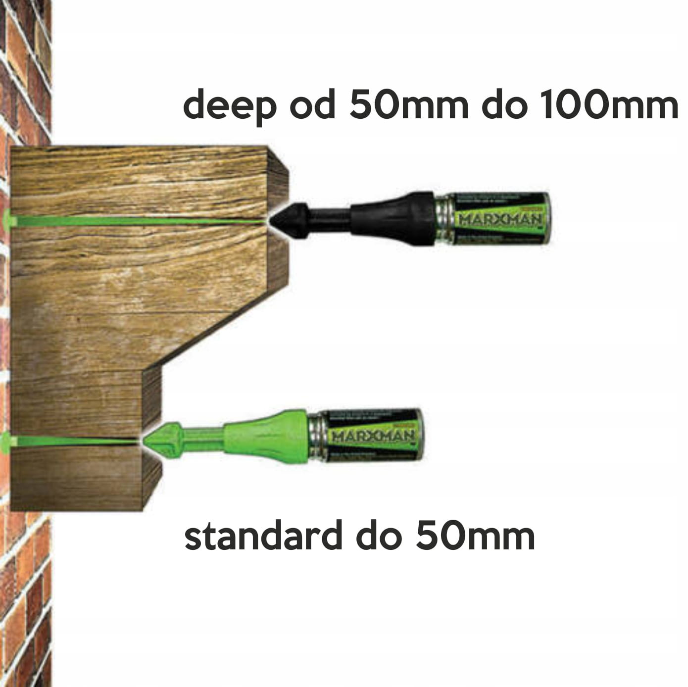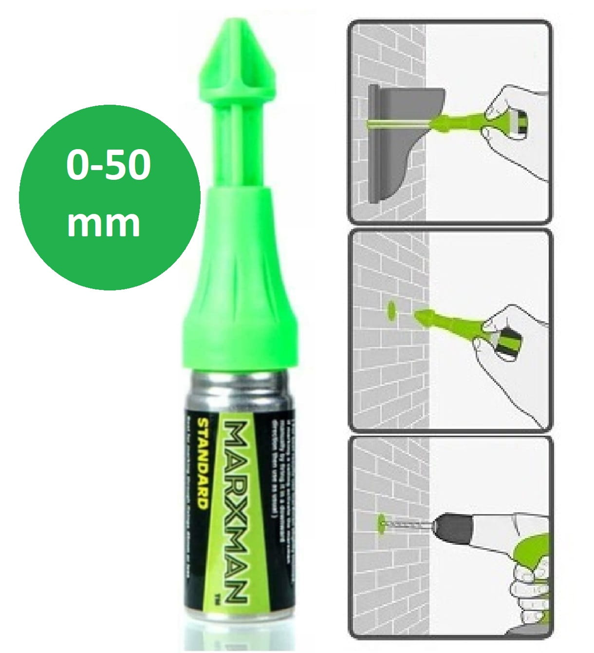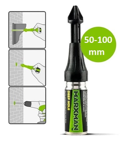 Marxman STANDARD MARX488767 to profesjonalny marker do zaznaczania miejsc wiercenia w otworach montażowych o głębokości do ok. 50 mm. Wystarczy wcisnąć końcówkę markera w otwór, a specjalny zielony proszek zostanie „wystrzelony” na powierzchnię – dokładnie wskazując, gdzie powinieneś wiercić.