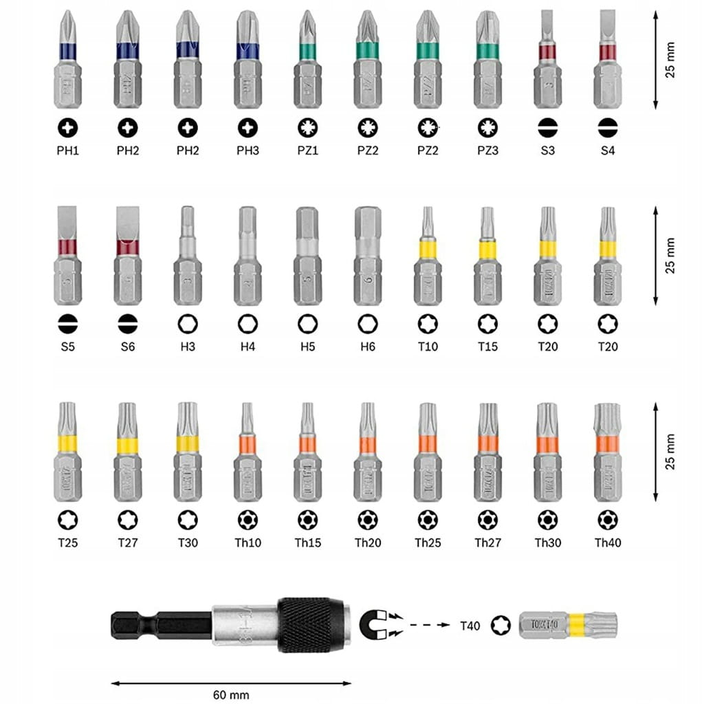 Szeroki wybór profili – PH, PZ, płaskie, Torx, Torx z otworem i Hex w jednym zestawie.