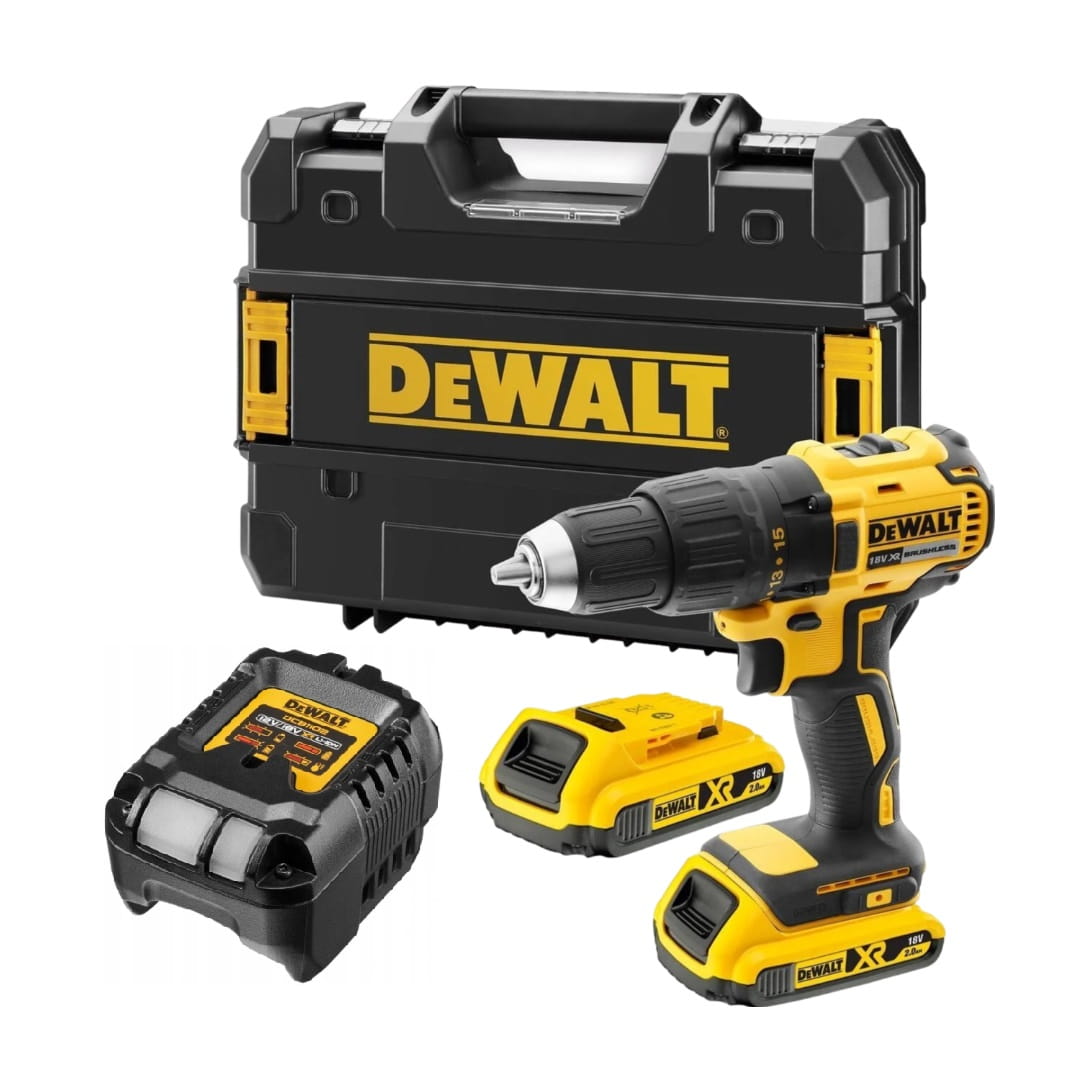 Zestaw DCD777D2T to komplet gotowy do działania – 2 akumulatory 2,0Ah, ładowarka oraz kufer TSTAK, dzięki czemu masz wszystko, czego potrzeba do pracy w terenie i w warsztacie.