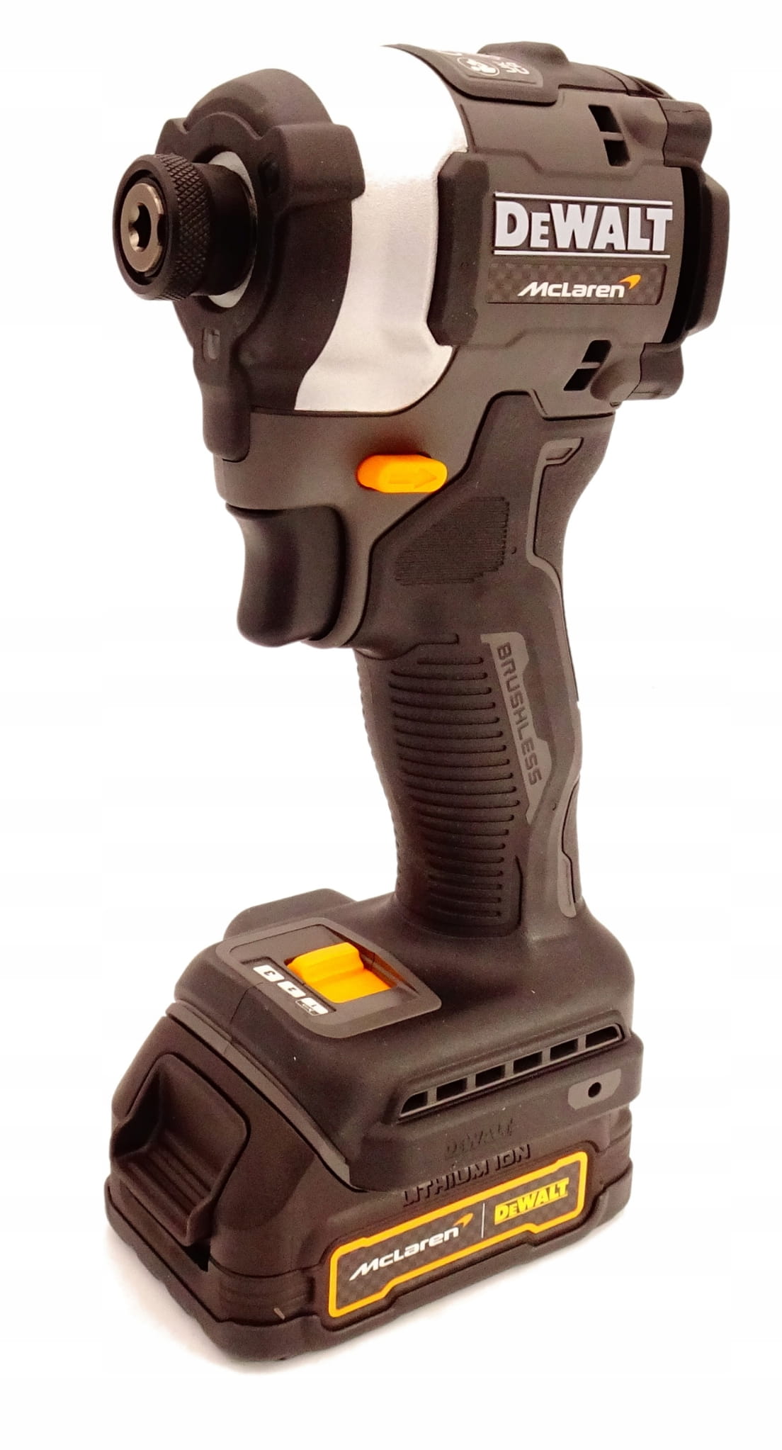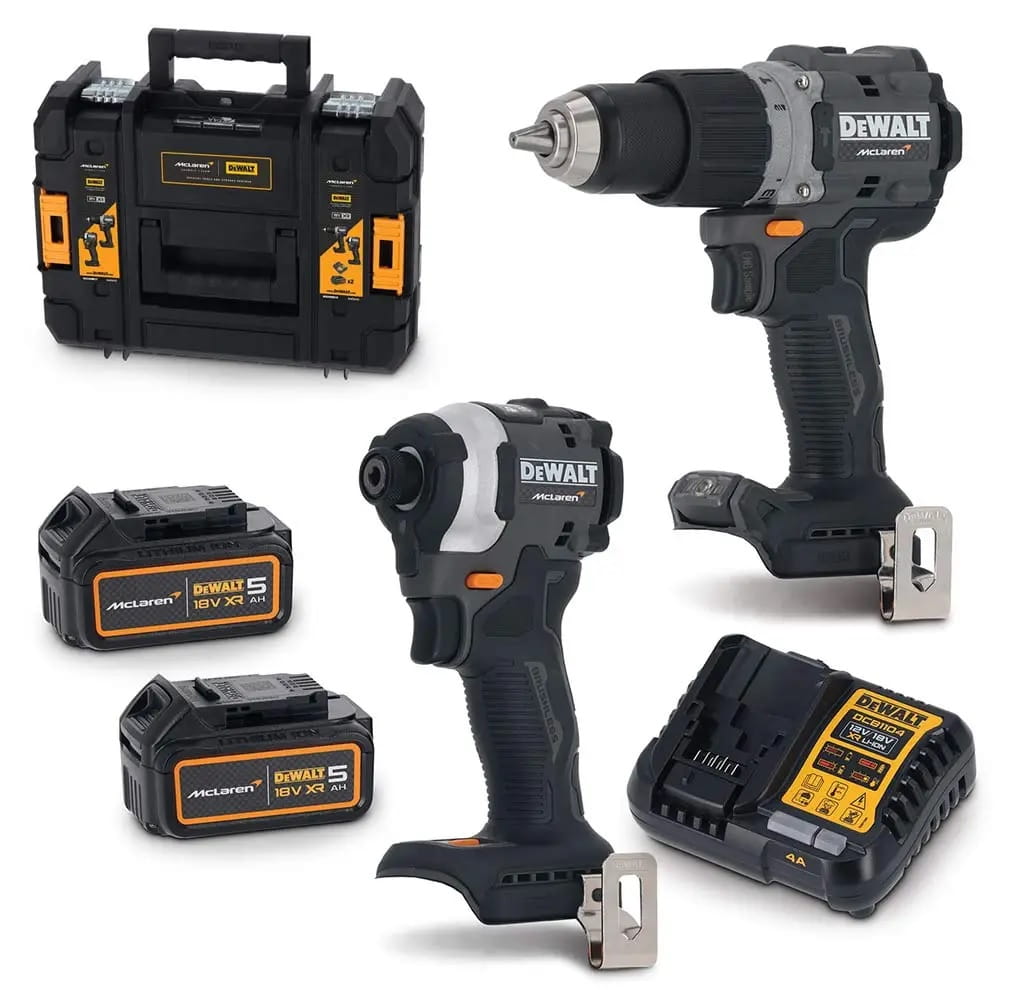 DeWALT DCK200MP2T Zestaw XR 18V McLaren – tempo, kontrola i gotowość do pracy (DCD85M + DCF85M + 2×5,0Ah + TSTAK)