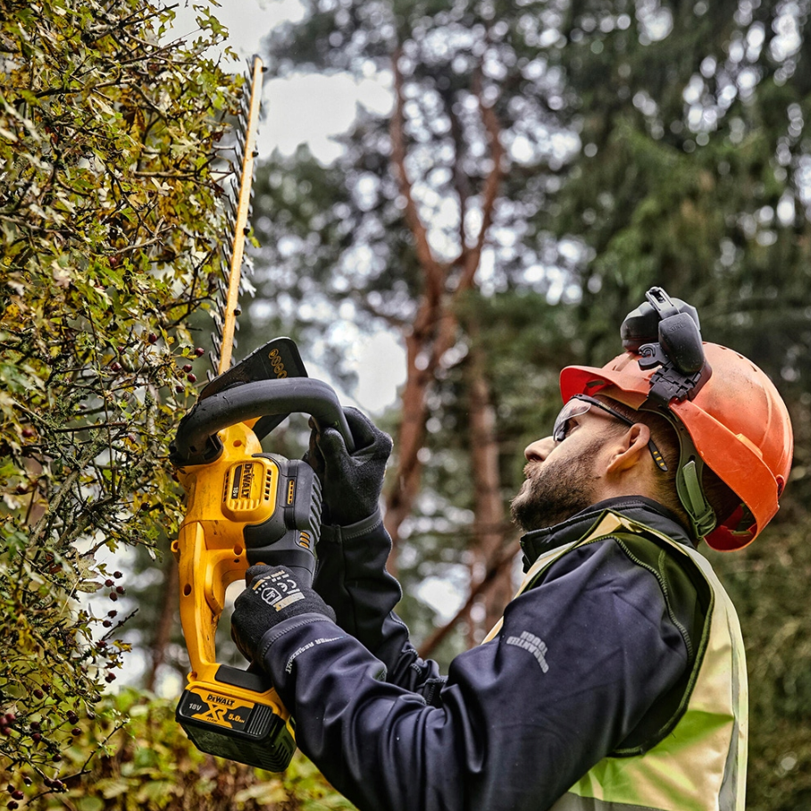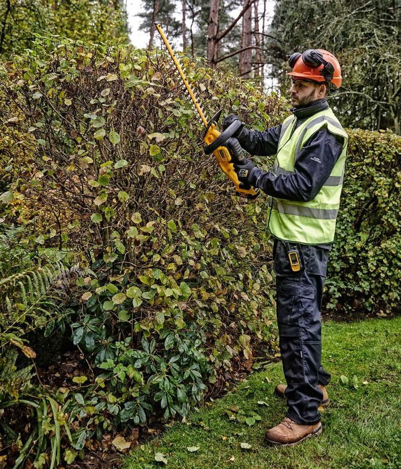 DeWalt DCMHT563N to poręczne, a jednocześnie wydajne nożyce akumulatorowe 18V XR do regularnego przycinania żywopłotów i krzewów. Długa listwa tnąca 55 cm przyspiesza pracę na dłuższych odcinkach, a 25 mm zdolności cięcia pomaga pewniej radzić sobie z gęstszą roślinnością i ogranicza zacięcia. Całość zaprojektowano z myślą o komforcie – waga narzędzia to 2,9 kg.