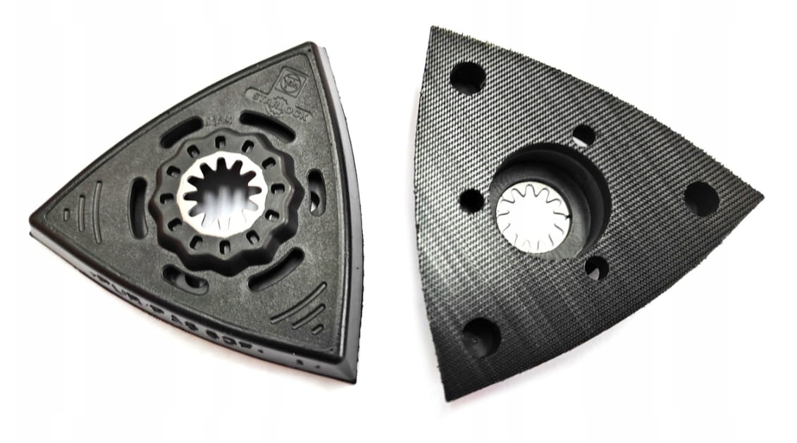 FEIN 63806136220 to profesjonalna stopa (płyta) szlifierska typu DELTA do multitooli z mocowaniem Starlock. Trójkątny kształt i krawędź 80 mm sprawiają, że idealnie nadaje się do szlifowania narożników, krawędzi i trudno dostępnych miejsc, a wersja perforowana (z otworami) ułatwia pracę z odciągiem pyłu.