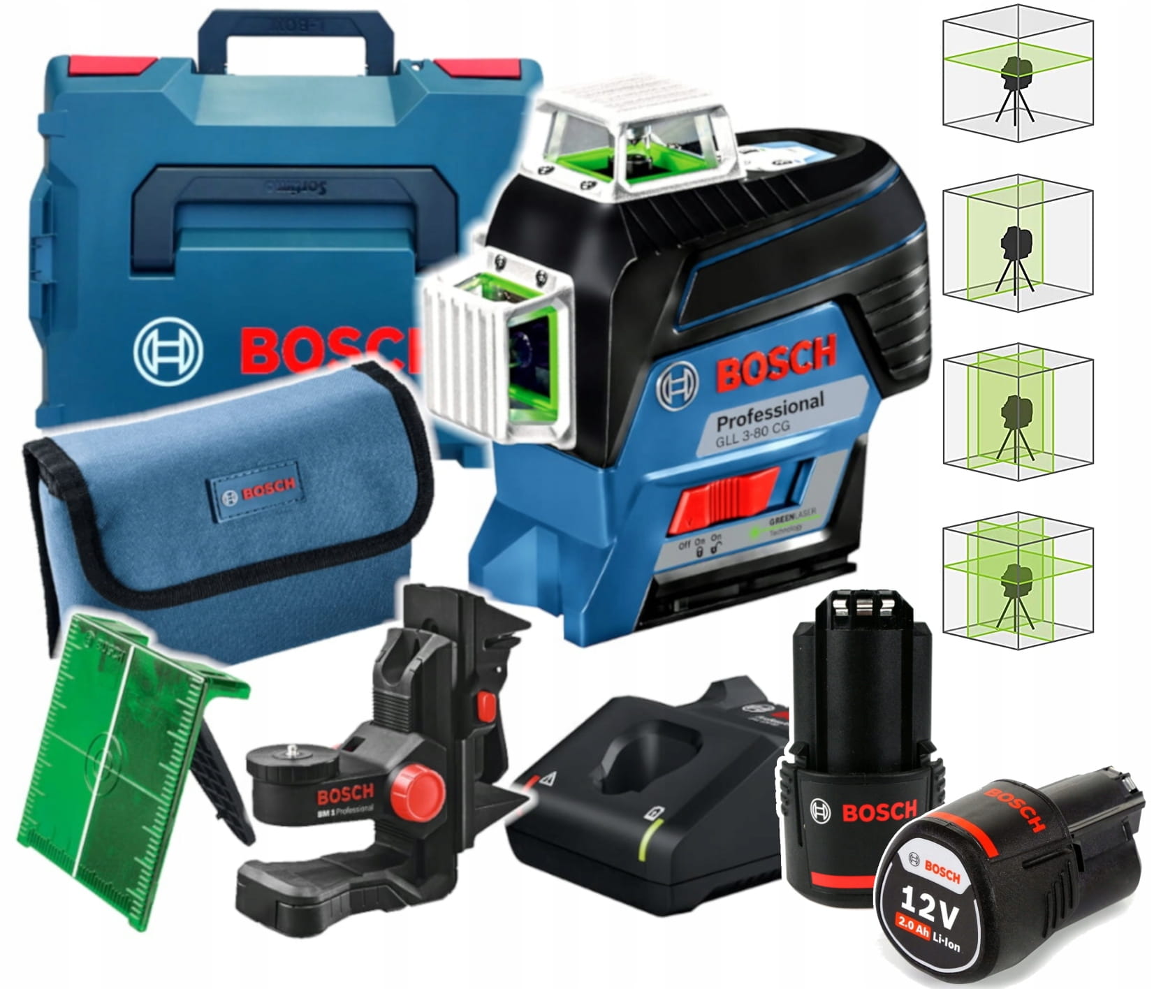 Laser liniowy Bosch GLL 3-80 CG 3x360° 30 m Zielony Krzyżowy 1x 2Ah L-Boxx