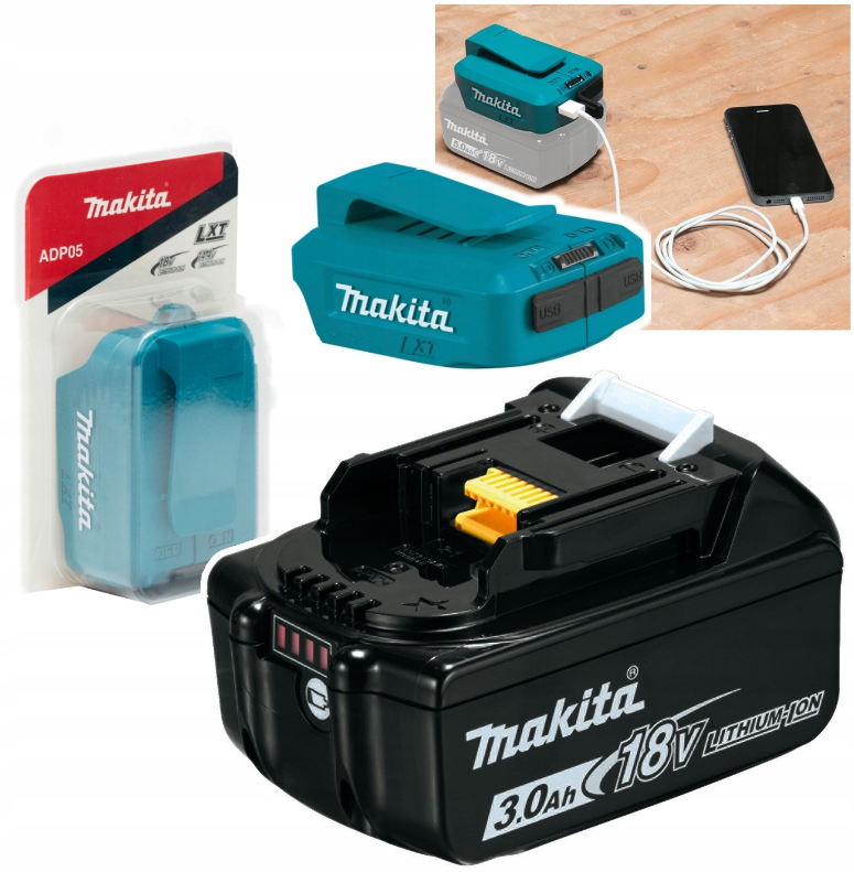 Makita BL1830B 18V LXT 3,0Ah + adapter USB ADP05 – zestaw premium: zasilanie do narzędzi i ładowanie USB w terenie