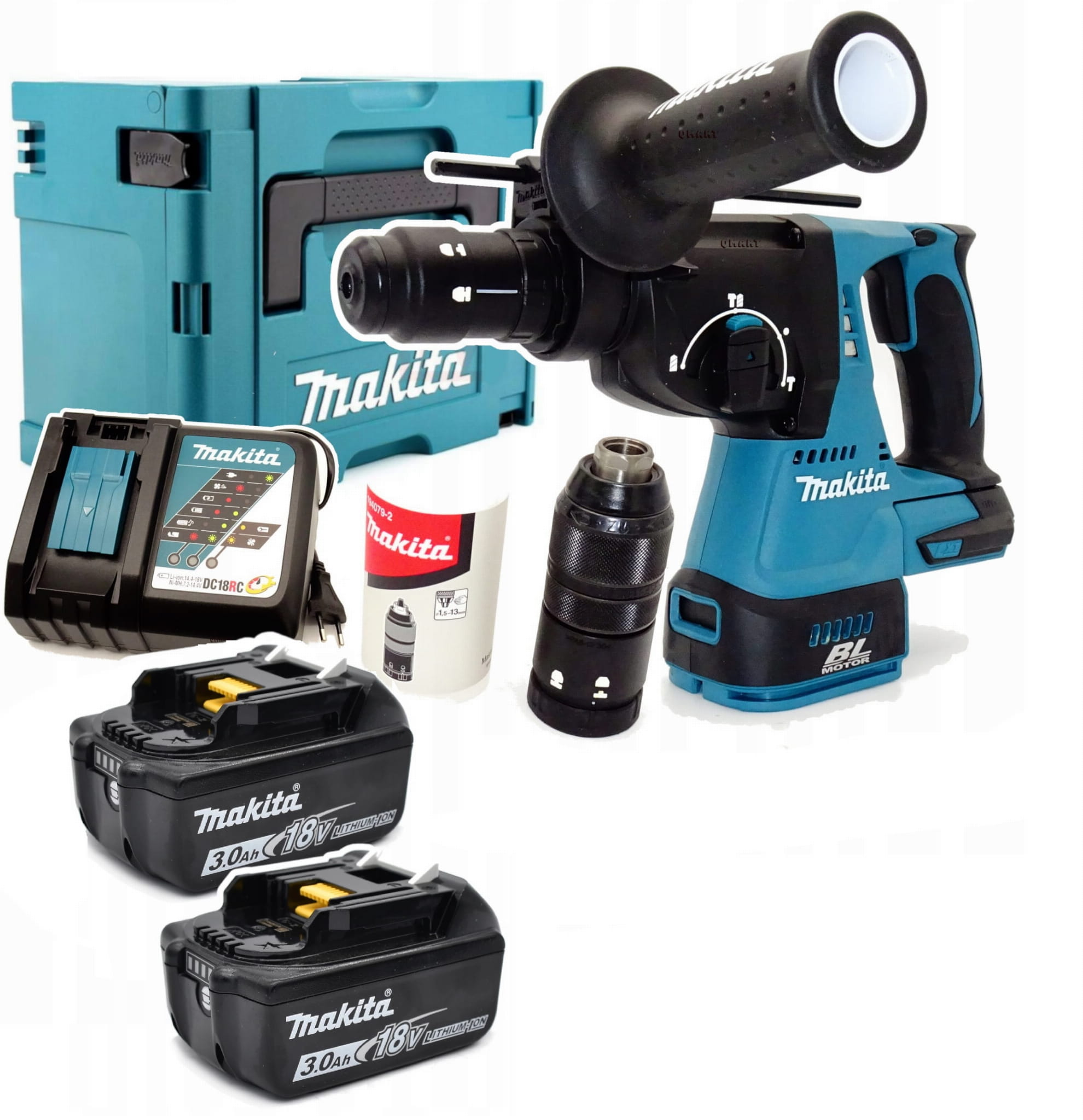 Makita DHR243RFJ – młotowiertarka SDS-PLUS 18V w komplecie 2×3.0Ah + szybka ładowarka + MAKPAC