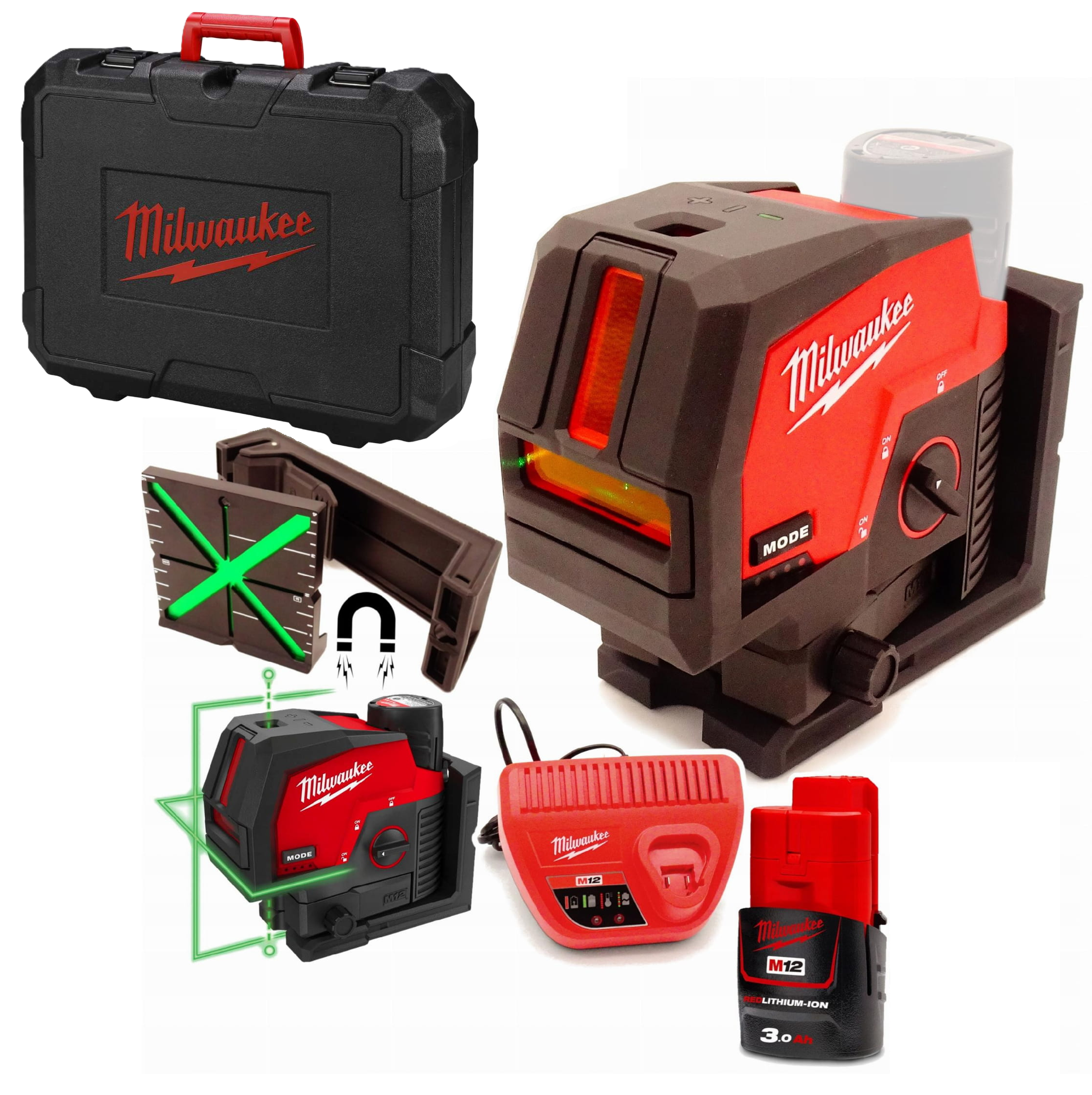 Milwaukee M12 CLLP-301C – laser krzyżowy M12 w komplecie (1x 3,0Ah + ładowarka + walizka)