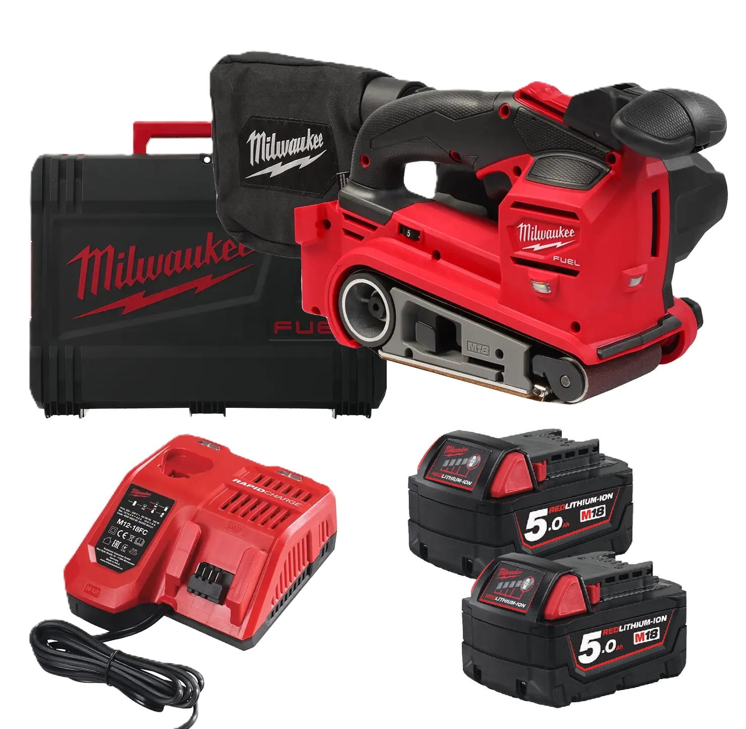 Milwaukee M18 FBTS75-502X Szlifierka taśmowa 18V – zestaw 2×5,0Ah + szybka ładowarka + walizka HD